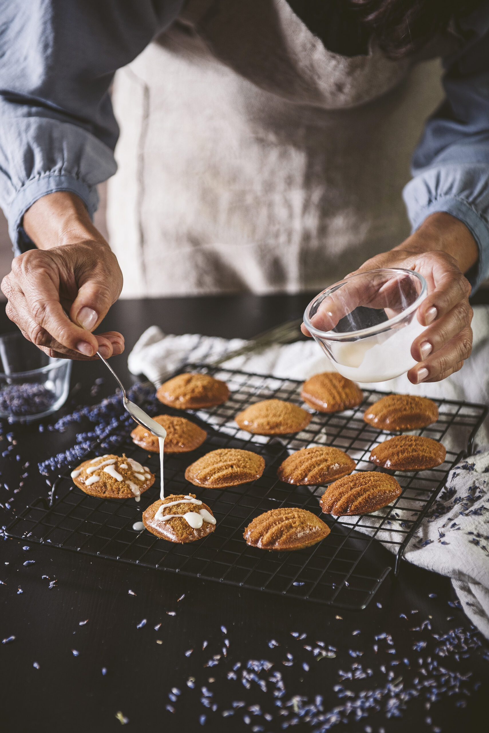 - La glassa si prepara aggiungendo pochissime gocce d’acqua ad un paio di cucchiaini di zucchero a velo, fino ad ottenere una cremina che andrà colata sulle medeleines. Subito dopo spolverare con qualche fiore di lavanda. Quest’ultima spolverata di fiori sarà determinante per il gusto e il profumo.
